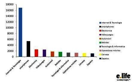 El gráfico de categorías repite el de marcas, aunque de forma menos abrupta. Internet y tecnología tiene casi 17.000 menciones, y queda la segunda smartphones con más de 5.500 menciones. Siguen electrónica y videojuegos, con algo más de 2.000 menciones cada uno, y por debajo quedan automóvil, bebidas, informática, operadores de móviles, cerveza y zapatos.