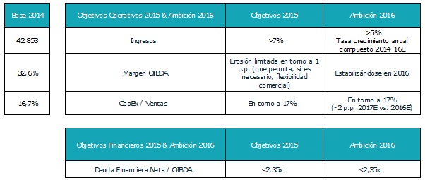 El OIBDA alcanza 708 millones de euros y acelera el crecimiento interanual en el último trimestre del ejercicio al 3,0% interanual (+1,5% en 2014) pese al negativo impacto de los cambios regulatorios (+5,6% interanual en enero-diciembre excluyendo este efecto; +7,6% en octubre-diciembre). Así, el margen OIBDA se sitúa en el 33,9% (+1,5 p.p. interanual) y en el 34,9% en el trimestre (+2,5 p.p. interanual).